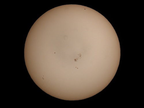 Erster Nachmittag des 7. Niederösterreichischen Teleskoptreffens. Noch ist es sehr sonnig. Einige wenige Teleskope sind da, die Auswahl eines günstigen Aufstellungsorts ist noch leicht - oder auch nicht, denn die Wahl bereitet auch Qual. Letztlich entscheide ich mich doch für den gleichen Platz wie im Vorjahr. Die Sonne besticht mit einer riesigen Fleckengruppe in der Mitte der Scheibe. Ich halte sie mit der Digitalkamera fest.