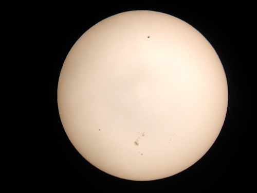 Dritter Nachmittag des 7. Niederösterreichischen Teleskoptreffens. nach dem Durchzug der Kaltfront kühl und sehr windig, aber extrem klar. Die Sonne besticht noch imemr mit einer riesigen Fleckengruppe, die aber schon nach unten gewandert ist. Eine zweiter, massiver Einzelfleck hat sich bemerkenswert entwickelt. Ich halte sie mit der Digitalkamera fest.