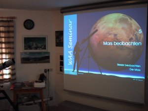 An diesem Nachmittag steht das neu überarbeite Seminar "Besser beobachten - der Mars" auf dem Programm. Auch mit Rekordbesuch, denn der Rote Planet in seiner besten Sichtbarkeit seit Menschengedenken lässt niemanden kalt.