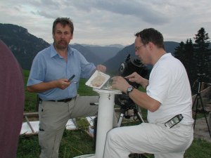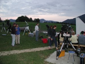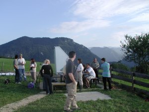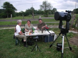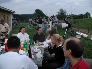 Immer mehr Leute strömen zu unserer Summer Star Party, bald sind es an die 70, mit gut und gern 20 Instrumenten. Jetzt hat sich unsere Summer Star Party wohl endgültig in die Liste der bekannteren heimischen Teleskoptreffen eingereiht, und ihre Stimmung ist sicherlich einzigartig. Und alle sollen belohnt werden: Die Wolken ziehen ab und hinterlassen eine sternenklare, laue Sommernacht.