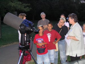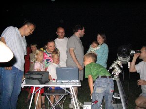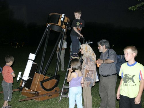 Schon in der Aufbauphase hat vor allem der "große" Dobson - ein Spielgelteleskop mit 45cm Durchmesser, und, wenn wir es genau nehmen, das drittgrößte Fernrohr, durch das man in Wien im Rahmen einer öffentlichen Beobachtung durchschauen kann - viele neugierige Blicke angezogen.