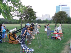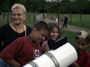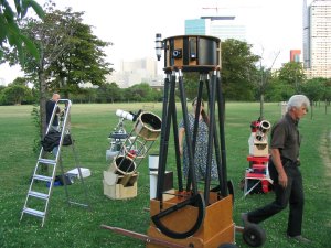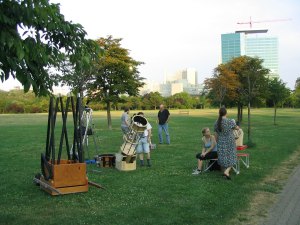 Unsere mobile Sternwarte wird immer größer - und kinderfreundlicher. Andreas Berthold und Roland Graf haben viele Exponate ihrer Dobson-Manufaktur mitgebracht. Dobson? John Dobson ist der Gründer der San Francisco Sidewalk Astronomers, deren Arbeit einst für uns Ansporn zur Gründung der WAA war. Wenn in einer amerikanischen Großstadt Astronomie "auf dem Gehsteig" gemacht werden kann, dann auch in Wien (wobei der Himmel in SF, um ehrlich zu sein, wegen der kalten Pazifikluft doch merklich klarer ist als in Wien). Und so entstand die "Mobile Volkssternwarte" nach diesem Vorbild. Und jener John Dobson hat auch eine eigene Fernrohrbauart geschaffen: Ultraleicht, leicht zu transportieren und dennoch gross.