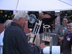 Trotz einsetzendem Regens bauen wir unsere Station auf, windgeschützt an der Innenseite der Terrasse. Unser Fernrohrpark ist heute bescheiden, nur ein kleiner Refraktor und zwei Mini-Dobsons finden in dem Zelt Platz. Wir benötigen sie, um zu demonstrieren, wie Fernrohre funktionieren.icht zu transportieren und dennoch gross.