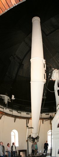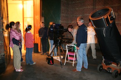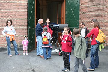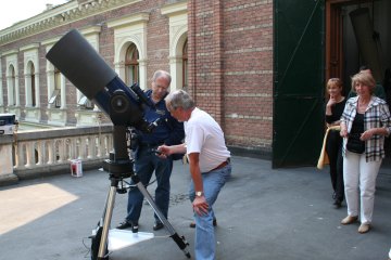 Wir haben für unseren Infostand auch ein paar Fernrohre mitgebracht; eigentlich ist das "Eulen nach Athen tragen", denn mit den Instrumenten der Universitätssternwarte kann selbst Rolands 45cm Dobson nicht mithalten. Aber wir wollen ja Amateurastronomie präsentieren. Die Profis verwenden größere Teleskope, und die sind natürlich eine ganz tolle Attraktion.