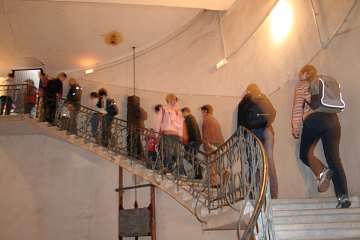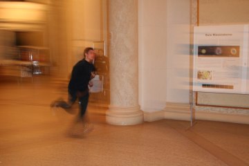 Zu späterer Stunde werden Besucher rarer, aber wir harren aus; die wenigen, die nach 22.30 Uhr noch vorbei kommen, sind natürlich umso interessierter. Langweilig wird es nicht; wer nicht fachsimplen will, nützt das weitläufige Gebäude einfach für sportliche Aktivitäten.