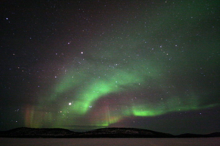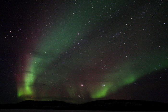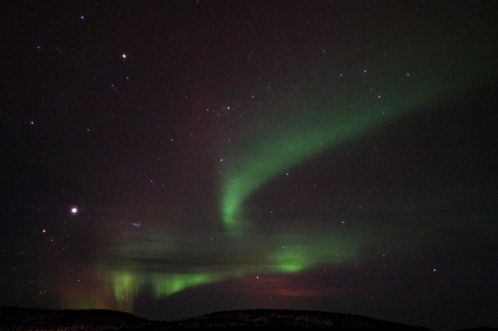 Die vierte Nacht unserer Polarlichtreise ist bisland die kälteste. Das Beobachten und Fotografieren des Polarlichts wird heute schon zu einer Herausforderung. Die Erscheinungen sind nicht so spektakulär wie am Sonntag, aber deutlich heller als gestern und teilweise sehr farbenfroh.