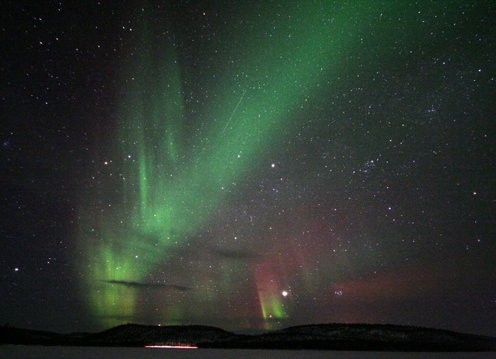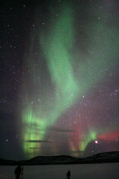 Die Farben kommen dadurch zustande, dass die Elektronen des Sonnenwinds die Atome in der Erdatmosphäre anregen. Es kommt zu Rekombinationsleuchten. Das grüne Licht entsteht durch angeregte Sauerstoffatome; violette und blaue Farbtöne entstehen durch Stickstoff und sind selten. Auch das rote Licht entsteht durch angeregten Sauerstoff (und nicht, wie fälschlich oft behauptet wird, durch Wasserstoff). Fortsetzung folgt ... |