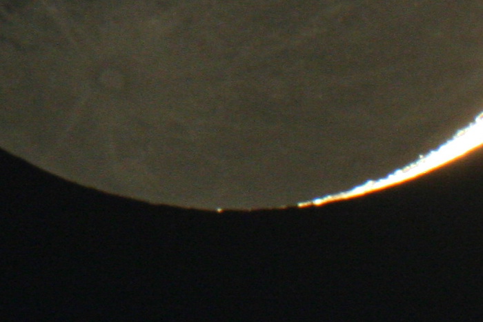 Nahe dem Südpol fällt mir eine von schräg hinten beleuchtete Bergspitze auf, die ziemlich weit vom Terminator entfernt ist - und doch noch ein Teil des Terminators ist. Ihr Anblick erinnert an eine streifende Sternbedeckung, es ist aber keine.