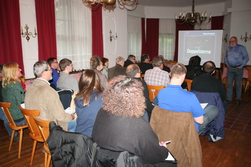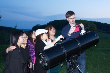 Am Samstag, 3. Mai, stehen die beiden Workshops zur visuellen Beobachtung von Planeten (Alexander Pikhard) und Doppelsternen (Thomas Schröfl) auf dem Programm. Auch heute ist an Beobachten nicht zu denken, trotzdem ist die Stimmung sehr astronomisch.